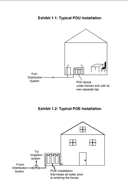 Different from central treatment plats that treat all water distributed to consumers, EPA.Gov[7] stated that the POE & POU treatment devices are designed to treat only a portion of the total flow. POU devices only filter water flow for direct consumption such as for drinking and cooking. It is normally installed at a single tap or limited numbers of taps at a water usage “point”, i.e. kitchen, bathroom. The POE devices are typically installed to treat all water entering a single home, business, school, or facility.