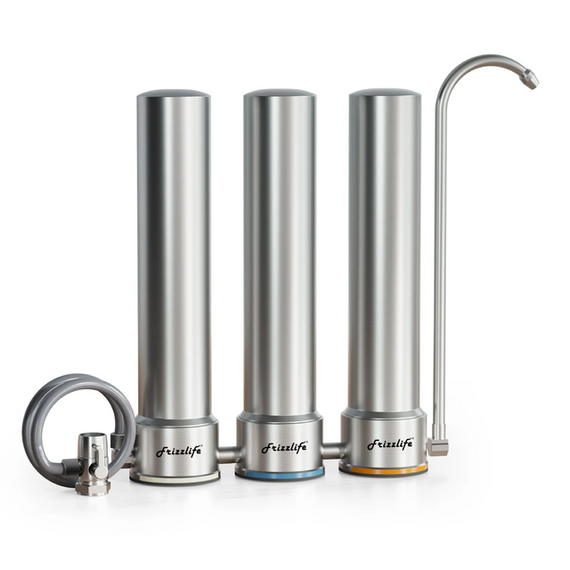 Frizzlife TS99 Auftisch-Wasserfiltersystem – 9-stufige Edelstahl-Wasserfiltration für Wasserhähne, 0,5 Mikron NSF-zertifizierte Elemente, reduziert 99,99 % Blei, Chlor, Schwermetalle, schlechten Geschmack und Geruch