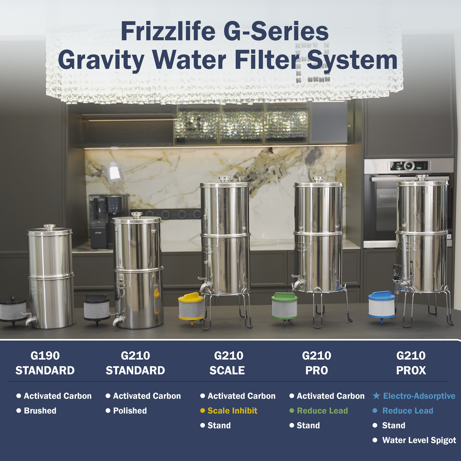 Sistema de filtro de agua por gravedad Frizzlife G210, con elemento certificado por NSF que reduce el 99.9 % de cloro, mal sabor y olor, y más de 10 impurezas. Sistema de acero inoxidable 304 para encimeras, ideal para el hogar y emergencias, 2.25 g.