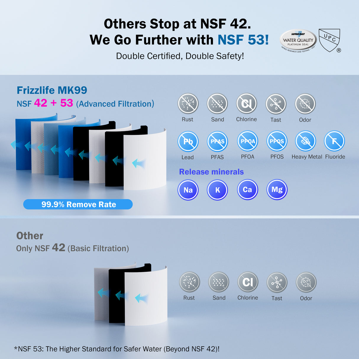 Certified 0.5 Micron Deep Filtration--The Frizzlife MK99 Water Filtration System includes a TWO-STAGE high-precision compound filter including a unique technology that reduces contaminants while leaving in all essential minerals. Certified to reduce Lead, Chlorine, Taste & Odor and Particulates. Additional reduction claims verified through manufacturer testing include Mercury, VOCs, Heavy Metals, and other contaminants, such as Turbidity. Enjoy great tasting water from the tap.