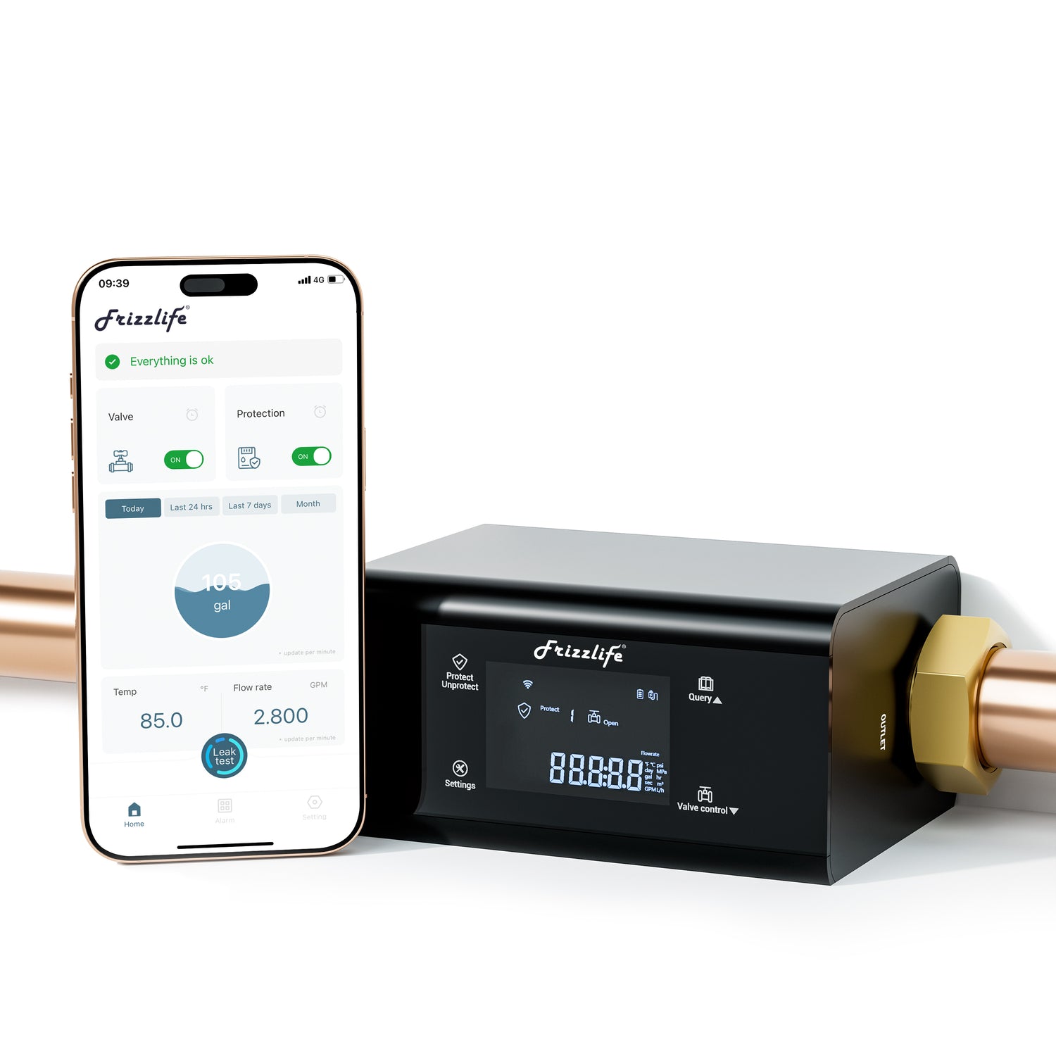 [Automatic Valve Shut-Off For Immediate Leak Response]--Protect your home effortlessly with the frizzlife leak protector. designed to instantly shut off the valve upon detecting a leak, it learns and adapts to your water usage patterns using intelligent ai technology, responding to everything from burst pipes and forgotten taps to subtle drips. frizzlife has you covered, providing peace of mind against water damage.