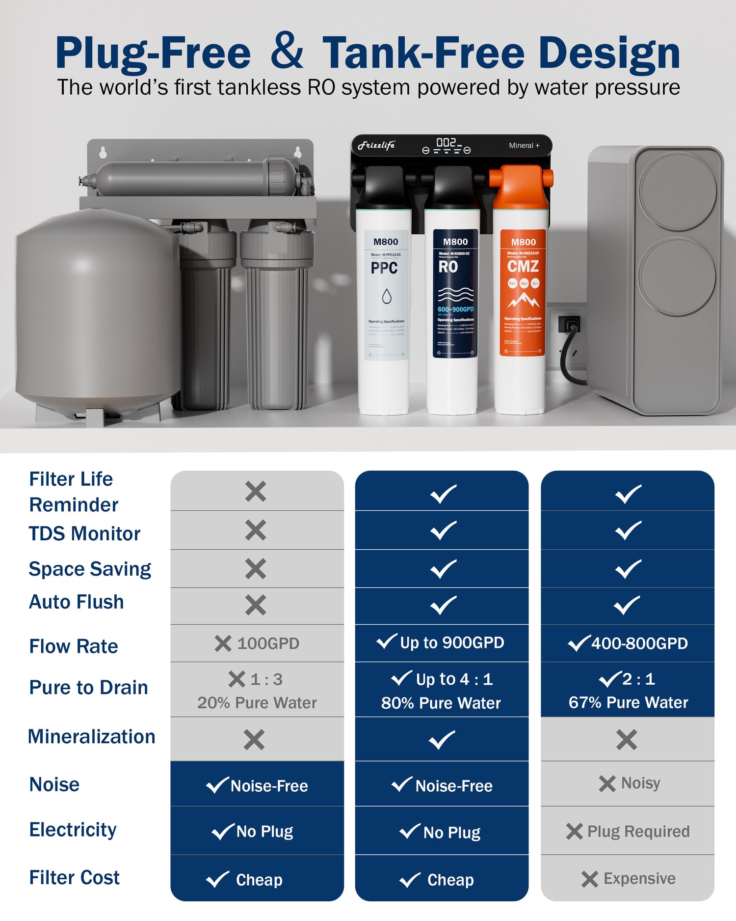 [World's First True-Spring Tankless & Cordless Design] No storage tank, no electricity, no noise! Frizzlife revolutionary tankless RO water filter uses existing water pressure to produce clean mineral-rich water on demand—saving space and energy while working silently under your sink.